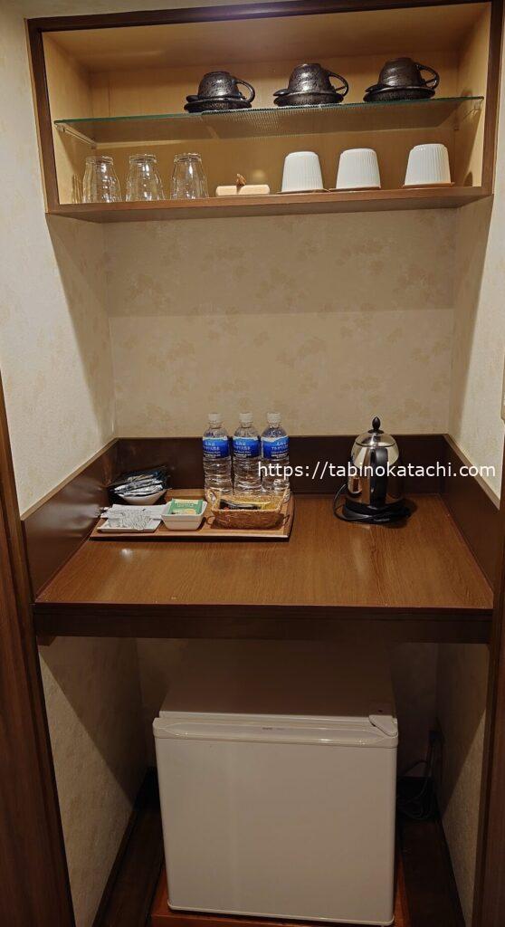 お部屋の冷蔵庫は空でしたが、ラウンジでもお茶やアルコールはいただけますし、ホテル内の自販機も充実しているので、困ることはなさそう。