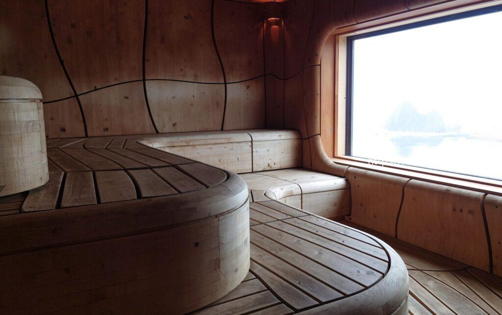 流氷をイメージされたというカクウナ。直線的でキリッとした印象のサウナ。