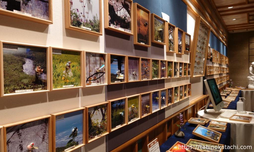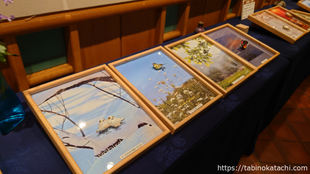 ホテルの中には、アート展示がされているエリアもありました。私達が伺ったときは、つぼみ工房 ラブバードテルアキさんの作品が、展示されていました。ラブバードとは、色付けがされた木彫の野鳥のアクセサリーです。かなりの種類の鳥が展示されていたので、圧巻でした。1つ1つ手作業で仕上げられているとのことで、これだけ多くの野鳥を生み出されるには、かなりの時間と愛情をこめられたのだろうなぁと感じました。