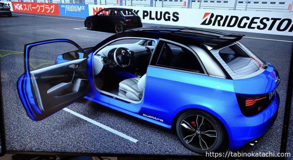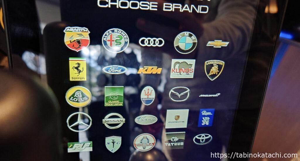 スタッフさんに、簡単に使い方を教わって、スタートです。メーカー・車種が自由に選ぶことができ、富士スピードウエイと同じコースを走ることができます。選んだ車種によって、内装も変わるそうです。