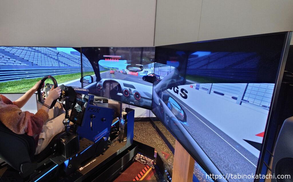 ドライビングシミュレーターは、ジムの一番奥にあります。こちらは、7:00-24:00の間で体験可能になっています。プロ仕様のシミュレーターなので、実際にプロの方も利用されるらしいです。本当の車に座って操作する感じになるので、アクセルやブレーキに足が届く必要があり、身長130cm以上の利用となっていました。