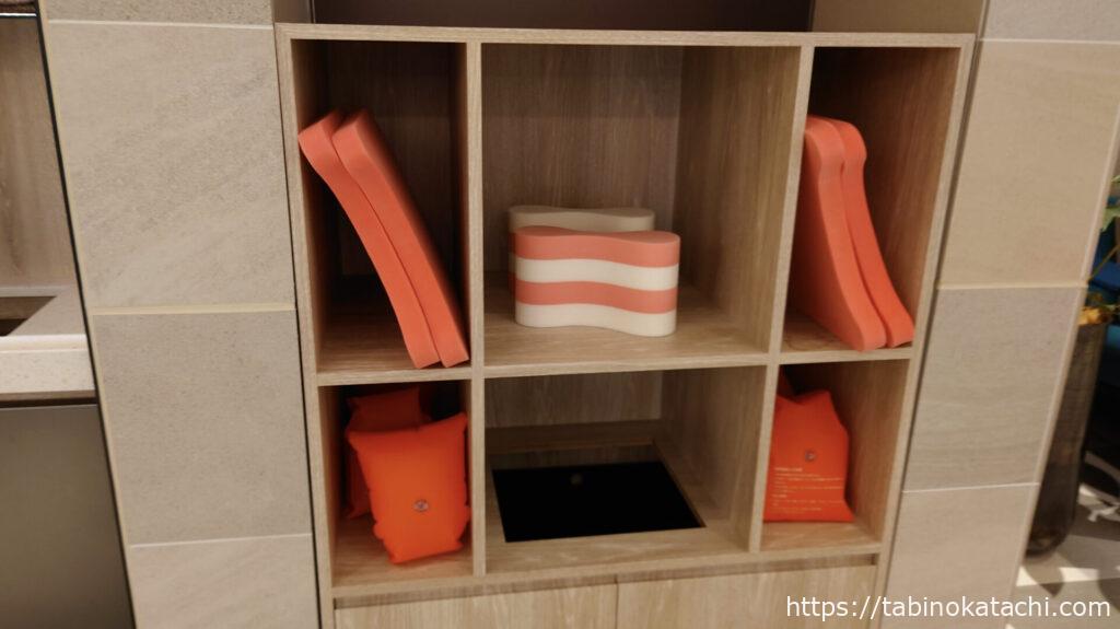 また、プールサイドには、ビート盤やアームフロートなどの用意もされていました。水着の貸し出しはありませんが、キャップとゴーグルの無料貸し出しの用意がありました。
