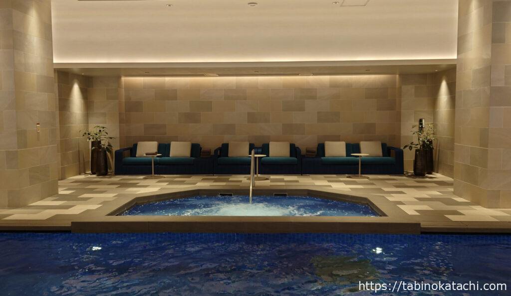 プール中央には、ジャグジーがあります。ジャグジー周辺の床が暖かかったので、おそらく床暖がはいっていると思われます。