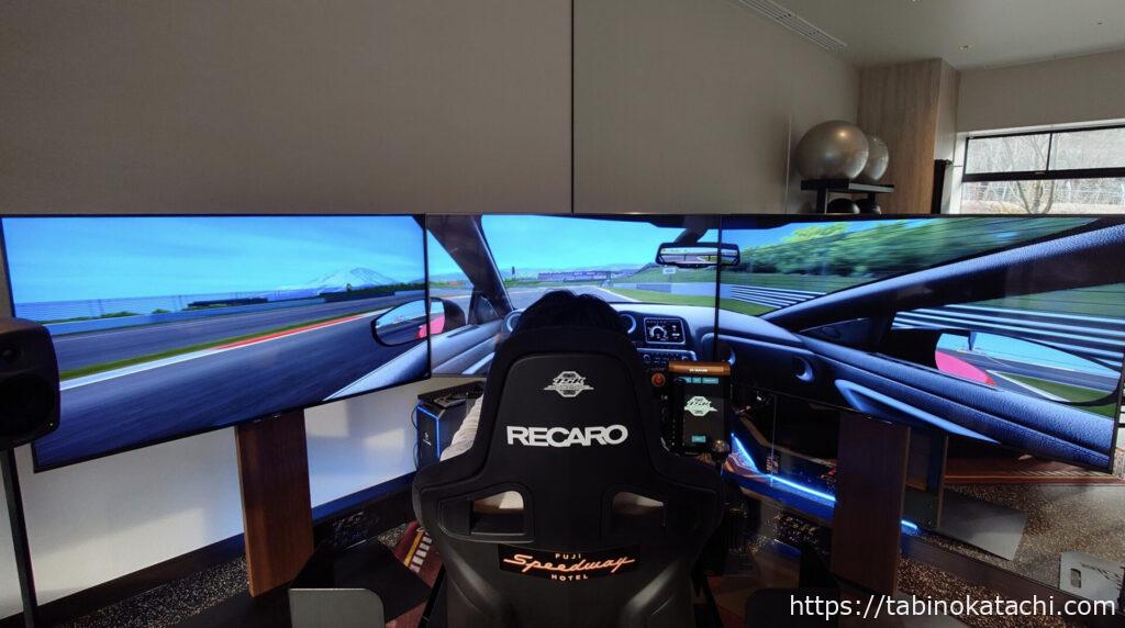 モータースポーツをコンセプトの1つにされている、富士スピードウェイホテルでは、無料で、レーシングシュミレータの体験をすることが可能です。大変人気があるようで、チェックインの際に希望時間を確認されて、予約をいれました。週末ということもあり、私たちの時は1組30分づつでした。結構本格的なので、車酔いする方もいるらしく、「できればお食事の後は避けられたほうが良いかもしれません」とアドバイスいただきました。たまたま夕食前の時間に予約ができたので、早速いってきました。