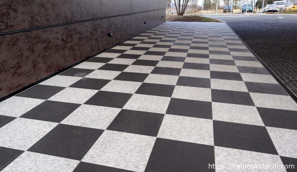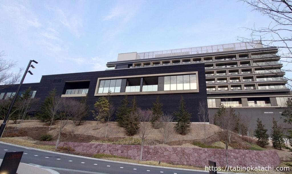 ジムやプール、温泉はホテル棟の隣にあるウェルネス棟に集まっています。レーシングシミュレータもジムの中に設置されているので、まずは、ヴィラ棟からホテル棟へ向かいました。ホテルの前にある少し低い黒い建物が、温泉、そして、1Fには、プールとジムがあります。