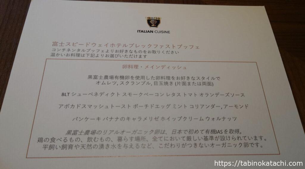 朝食も、ディナーと同じイタリアンレストランのTROFEOでいただきました。洋食・和食の用意があり、洋食は卵料理が選択可能、和食は和朝食のお弁当スタイルです。どちらを選んでも、レストランの中央にあるビュッフェよりお料理・ドリンクを取ってくることが可能です。