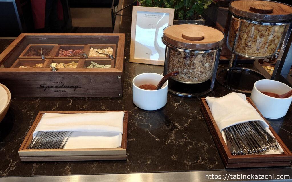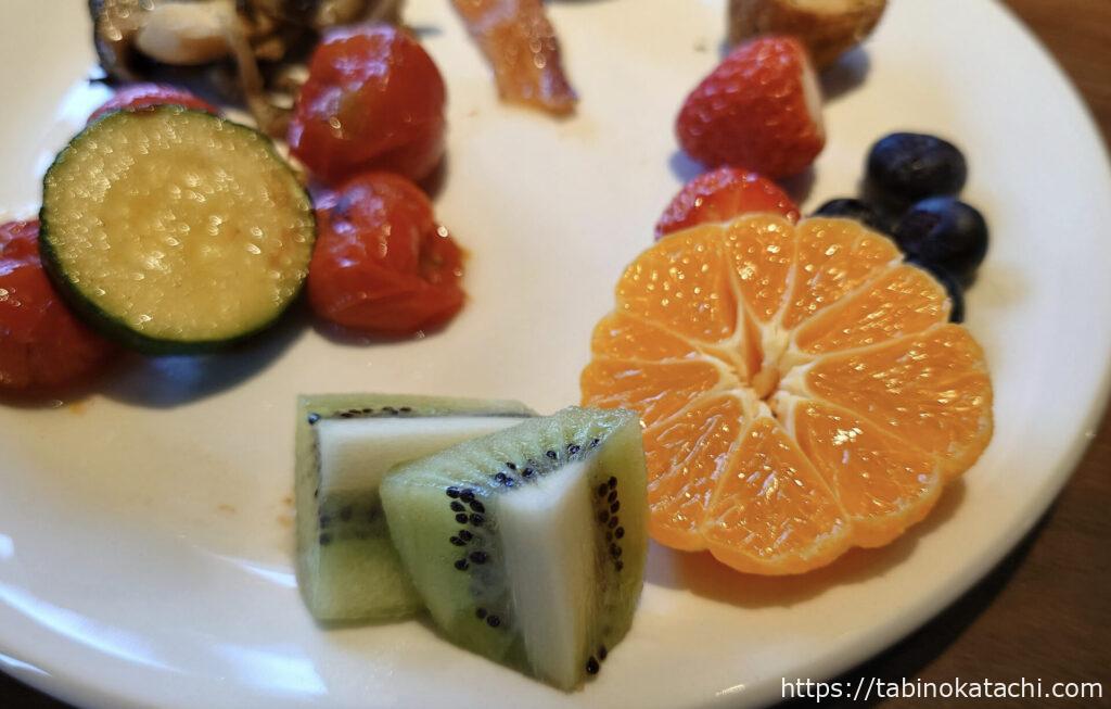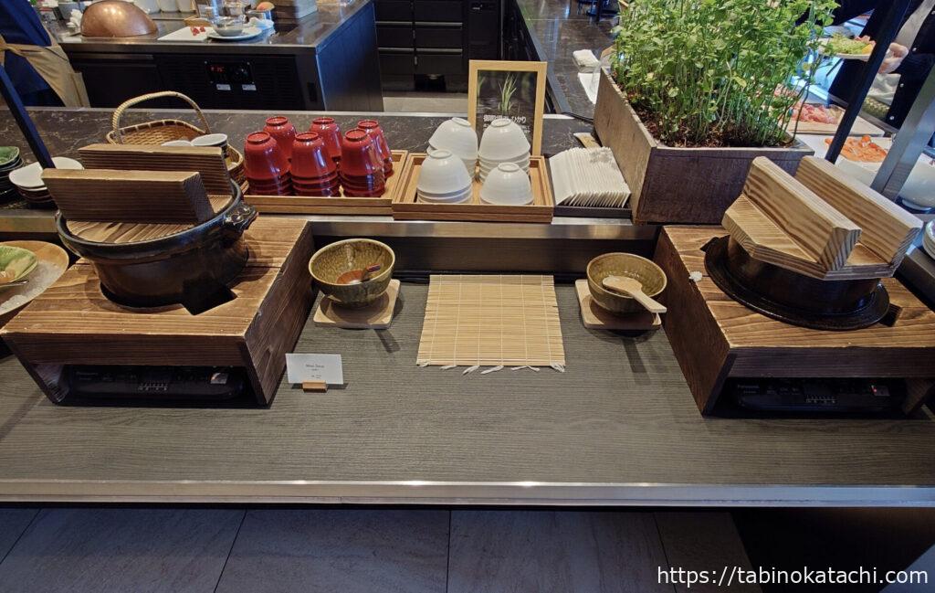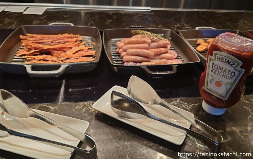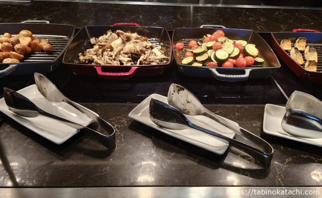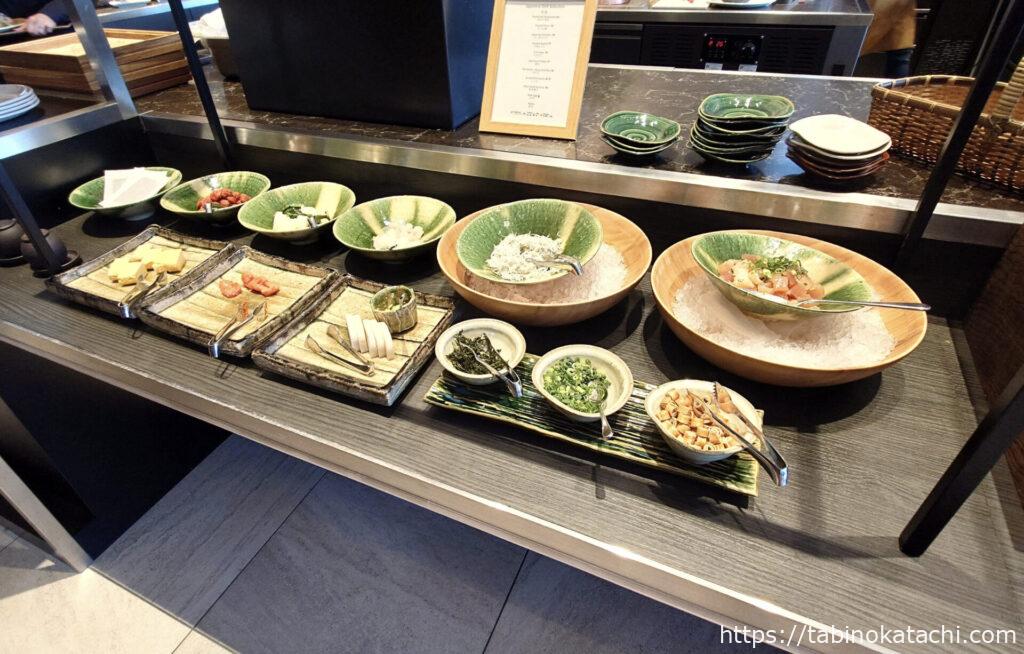 ビュフェには、ベーコンやソーセージ、シリアルやヨーグルトといった朝食の定番品から、グリル野菜、きのこ、焼き魚、ベイクドポテト、フルーツ、追加のブレッドなどが揃えられています。また、和食用のコーナーには、お味噌汁、ご飯のお供いろいろ(お刺身漬、しらす、明太子、かまぼこ等)。全てではありませんが、ちょこっとご紹介。