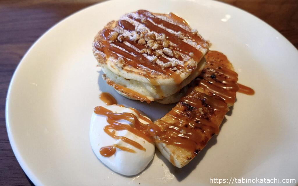 和食弁当の「とろろ汁」は、丁子屋さんの本店か富士スピードウェイホテルでしかいただけないとうことことで迷いましたが、今回は洋食を選択。アボガドのポーチドエッグが食べてみたくて。オーダーしたポーチドエッグには、上にミントやコリアンダーがのっていて、よいアクセント♪あおめくんと、息子はバナナのキャラメリゼが添えられたパンケーキを選びました。パンケーキがかなり美味しかったそうです。