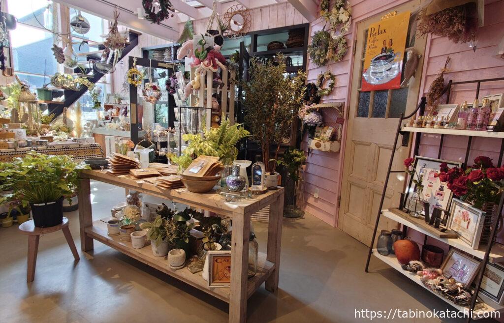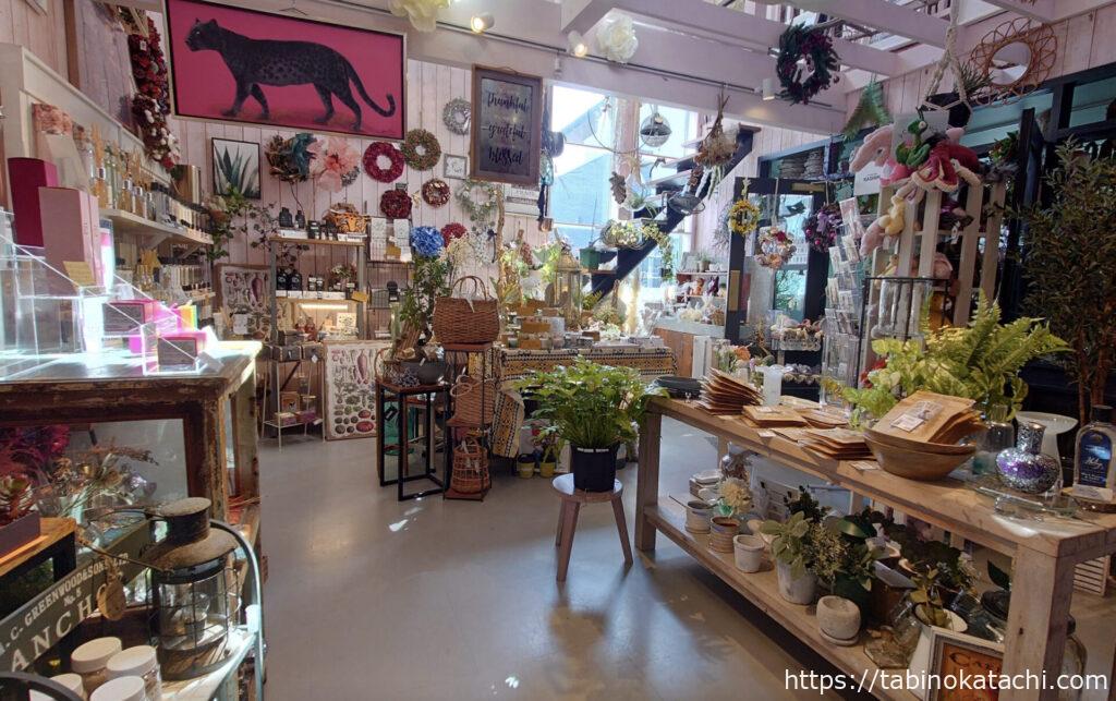 お店の外にも観葉植物などがたくさんおいてあり、なかにはいると、花器やリース、パフュームなどがとろこ狭しとディスプレイされています。