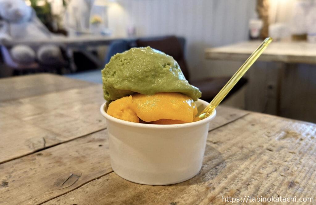 お店にはいって、右手がカフェになっていて、こちらもディスプレイが可愛い♪オムライスやパスタ、パンケーキ、バインミー(サンドイッチ)などもあるので、ランチも可能です。すでにランチは済ませてきていたので、今回は、ジェラートと、自家製のタルト(いちごバージョン)をいただきました。