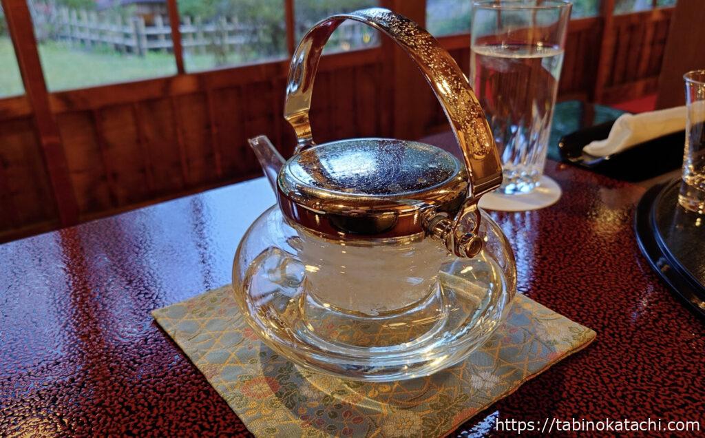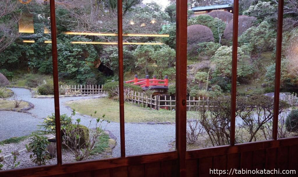 席数としては60席用意があるようで、基本は畳敷の大広間に、机と椅子が配置され、衝立で仕切られているつくりです。お席次第ですが、私たちは、たまたま窓側のお席だったので、外の庭園がよく見えました。