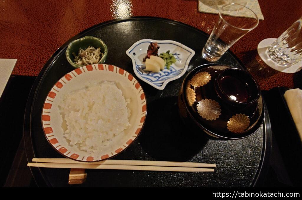 最後にごはんは、福島県産の天のつぶ。しらすとわらびの煮浸し。赤出汁。
