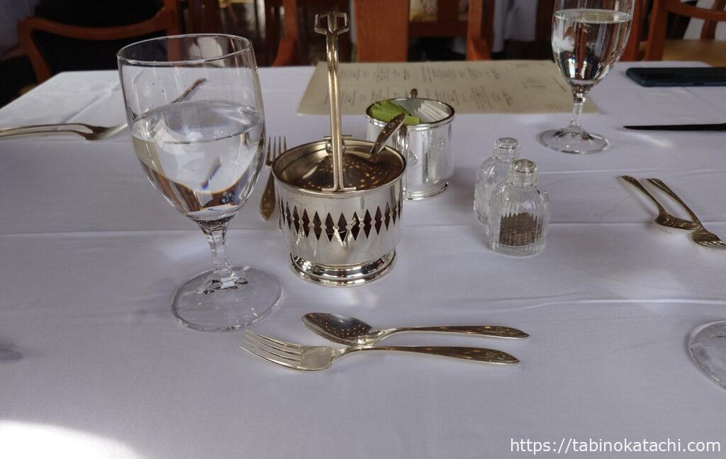 真っ白なテーブルクロスにカトラリーが並べてあり、気持ちが引き締まります。天井の絵柄も1つづつ違っていて、見ているだけでうっとりでした。