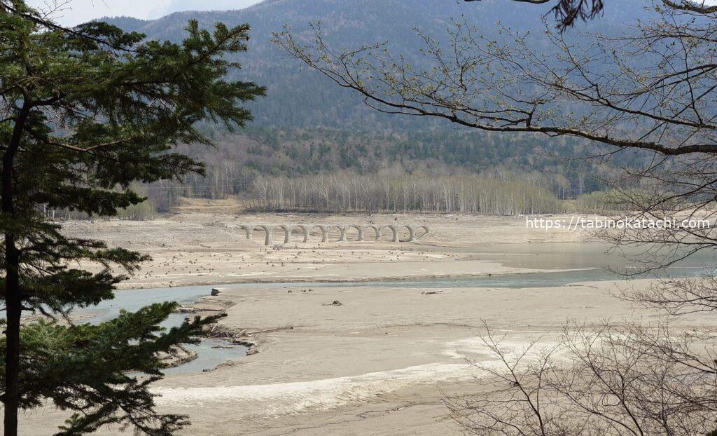 旧国鉄士幌線のコンクリートアーチの1つで、糠平湖の水位が下がる1月〜6月ぐらいまでの約半年間しか見ることのできない幻の橋といわれています。毎年、湖の下に沈んでしまうので、年々、橋の劣化が進んでいて、現在の11連アーチがみられるのは、2023年が最後ではといわれています。