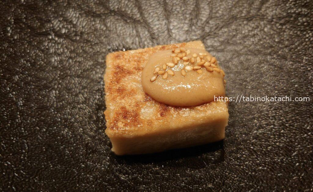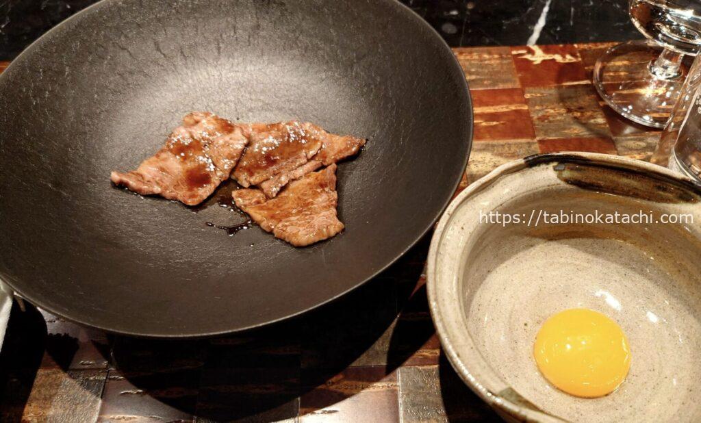 お醤油の焦げるいい香りがただよってきたかとおもうと、お次はヤキスキ。三島のブランド卵である、「日の出卵」の黄身だけを、贅沢に纏わせていただきます。