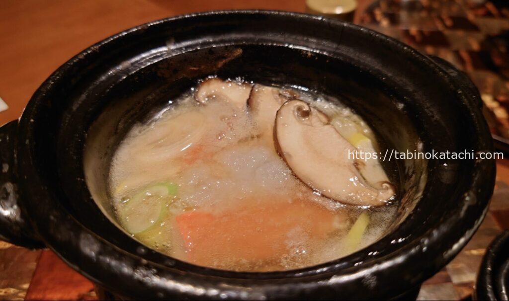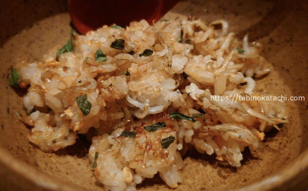 大葉の香りと、シラスの風味が美味。途中まで食べた所で、お出汁をいれてお茶漬けへ。出汁とガーリックライスの旨みが相まって、ペロリと完食です。