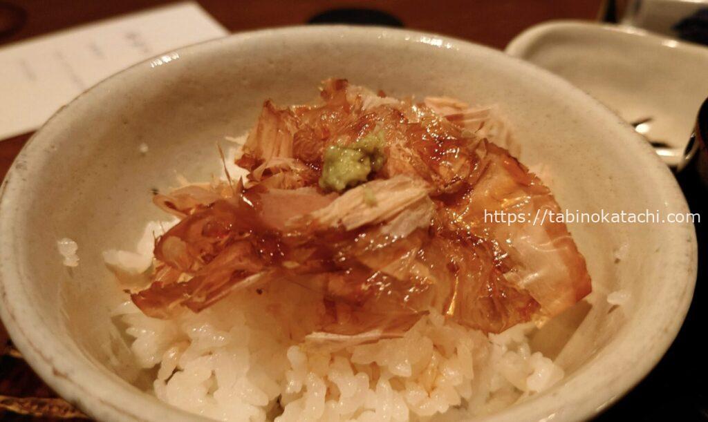 〆のご飯は、鰹節をたっぷりかけたワサビご飯でした。