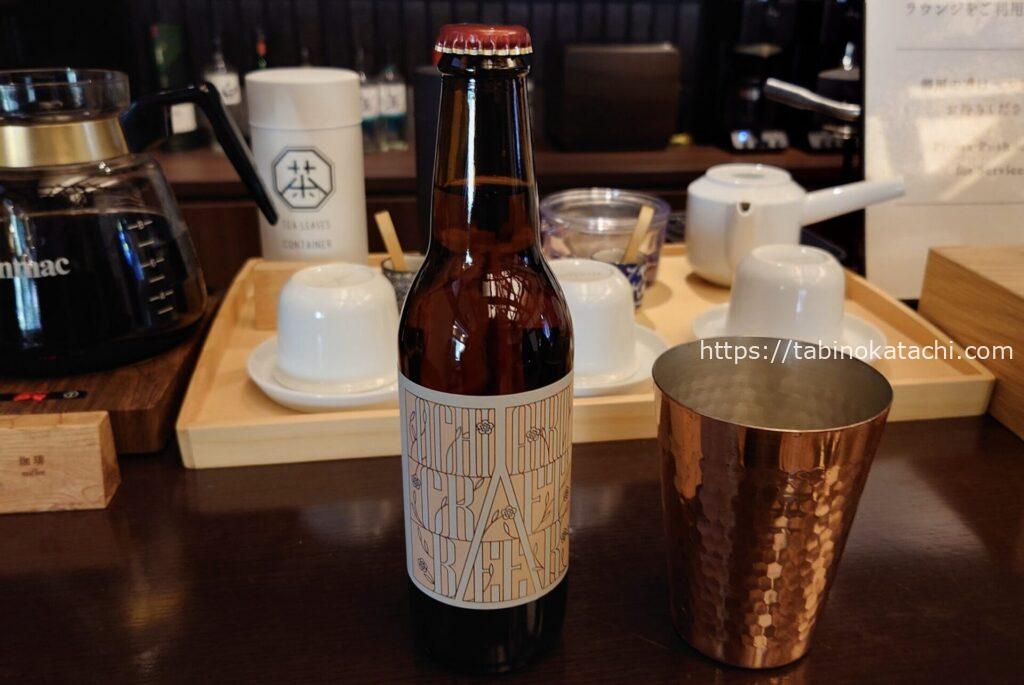 ブロンズのタンブラーに入れるので色は分かりにくいですが、濃い琥珀色。ラベルに書いてある通り少しスパイシーで、味も香りもIPAに近く、苦みが強い。ビール好きのあめおくん曰く、IPA好きには癖になる味なので、宿泊したらぜひ飲んでもらいたいとのことです。