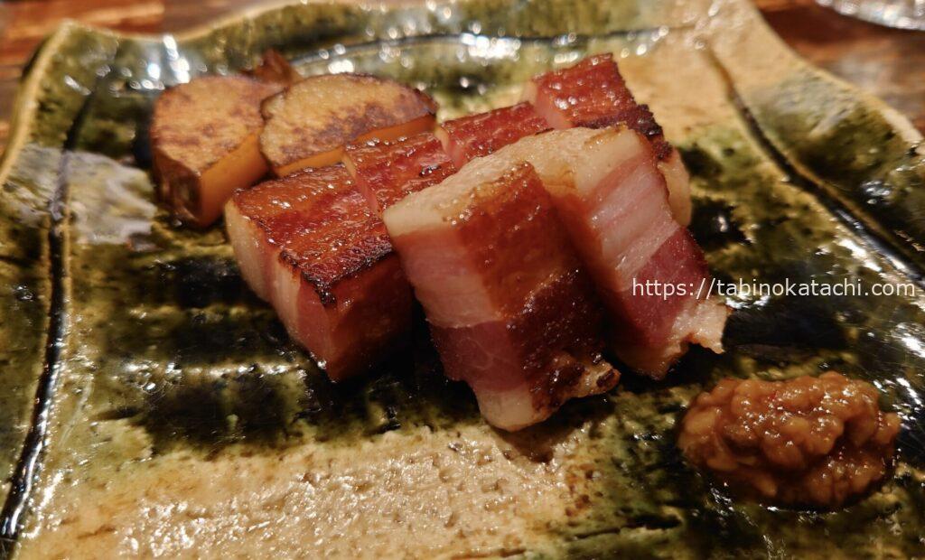 猪のベーコン。初めていただきましたが、豚のベーコンより脂身部分があっさり。噛めば噛むほど、じわっと旨味が溢れます。