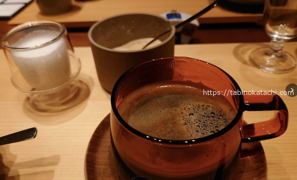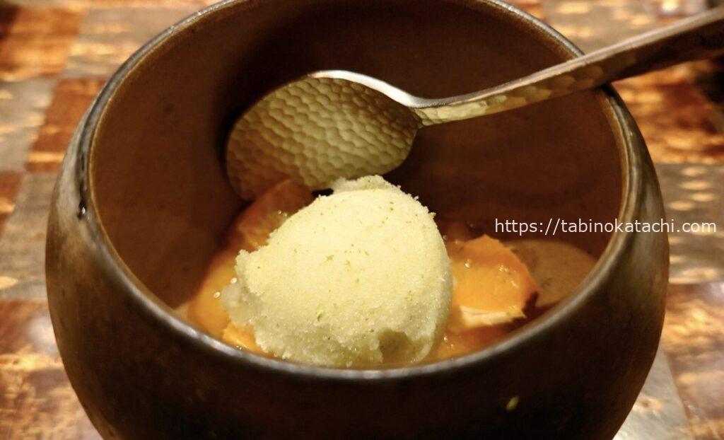 デザートには、伊豆ミカンとゼリー、ハーブのシャーベット。ハーブのサッパリと、みかんの甘みがじわっと口の中にひろがります。最後に、コーヒーもいただいて、今日もごちそうさまでした。