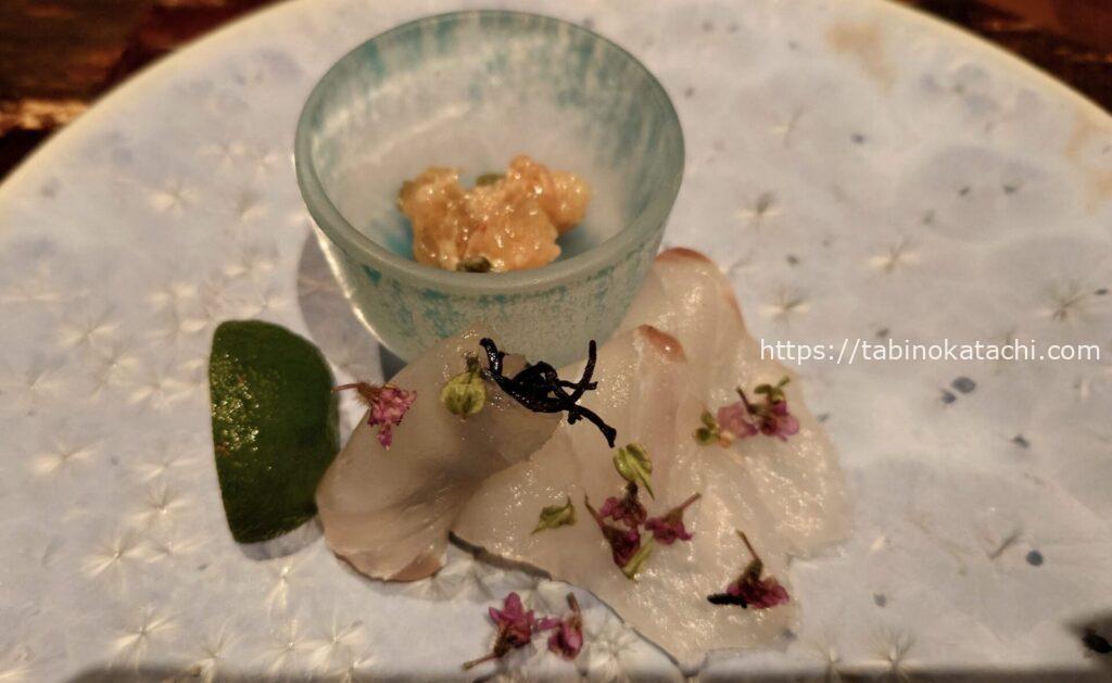 底引きでとれるテナガエビをつかったアミューズ。希少価値の高いテナガエビは、本当に甘くて、とろけていきます。
