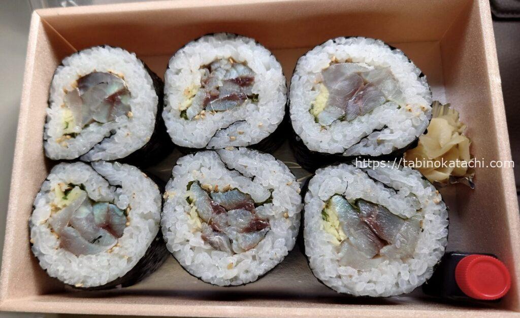 大葉の香りが効いた あじ巻き寿司。酢飯のお酢加減も好み♪