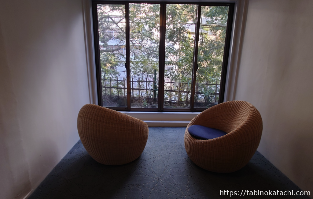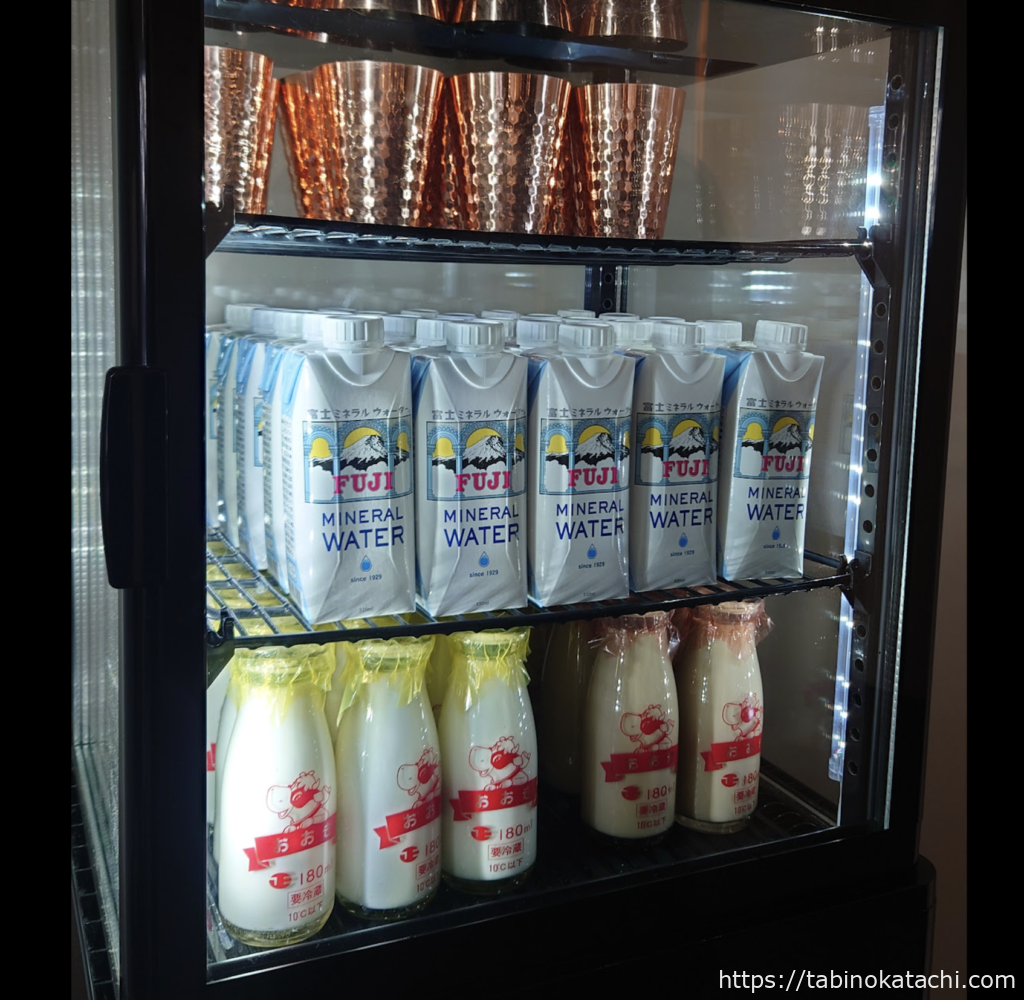 入り口の前には、デザインの異なるチェアが2組おいてあり、生ビール、富士ミネラルウオーター、牛乳、コーヒー牛乳が常備されています。冷えたグラスもはいっており、おそらく熱伝導に優れた銅製だとおもわれます。我が家は、お風呂から近いお部屋だったので、そのままグラスにいれて、お部屋に戻っていただいたりもしていました。