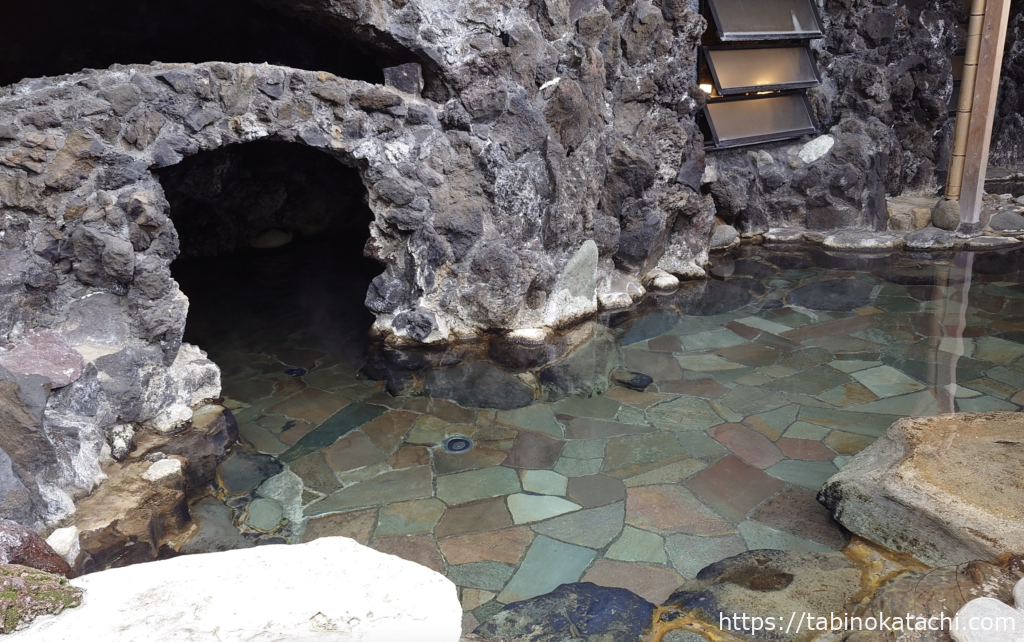 大浴場の扉をあけたところから、岩場のようなデザイン。露天風呂になっていることもあり、月の湯とはまったく印象がかわります。外の景色がみえるので、開放感があって気持ちよかったです。