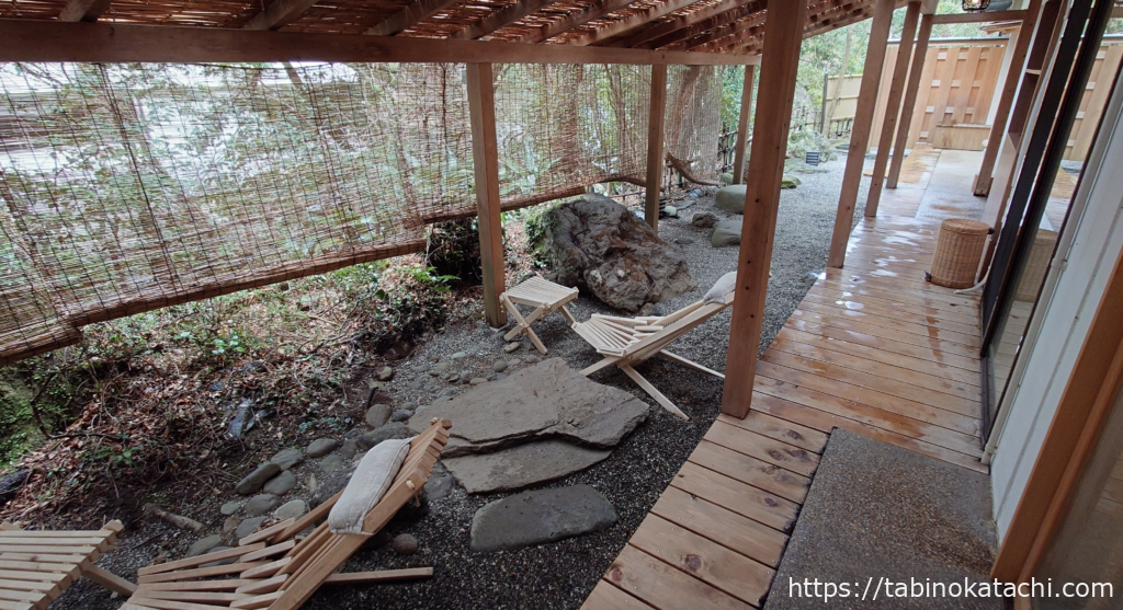 こちらが、ととのスペース。すだれの奥に建物がありますが、旧おちあいろうの建物で、今は使われていないということなので、安心して?ととのえます。こちらのリクライニングチェアは、サウナスイートキャビンにもあったのものと同じでした。こういった木製のチェアは、風情もあるし、雰囲気がとても素敵だけれど、座るとゴツゴツしているので、私個人としては、コールマンとかのリクライニングチェアとかのほうが好きだなぁ。