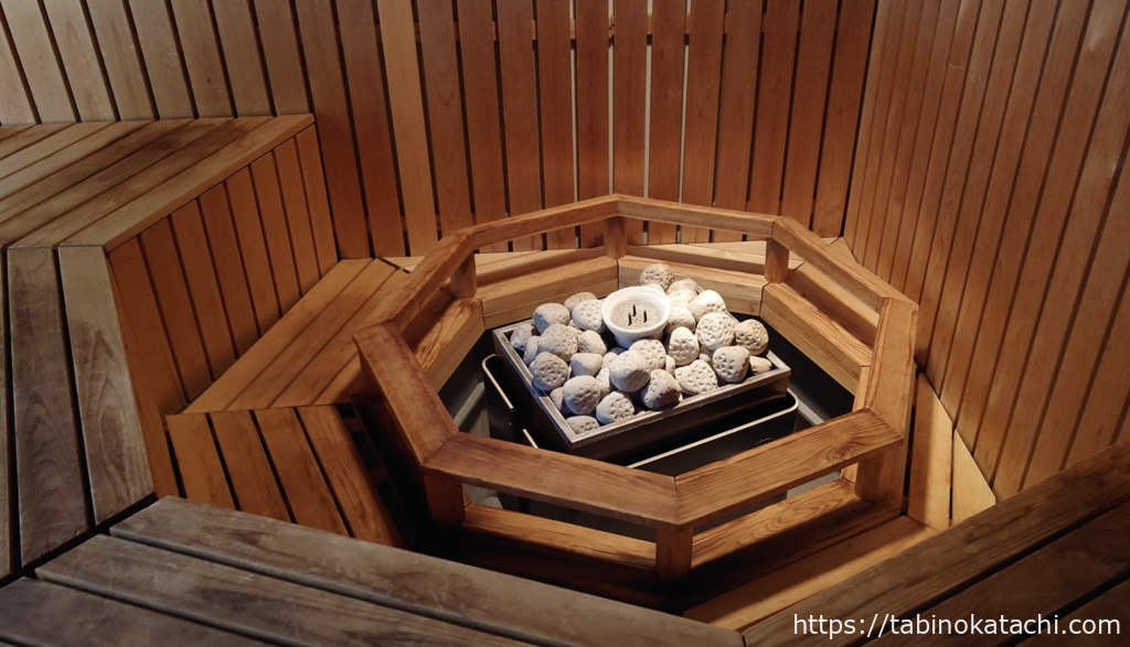 サウナの中は、八角形の囲いにサウナストーンがはいっていて、自由にセルフロウリュウすることができます。サ室が広めということもありますが、川側は全面ガラス張りなので、かなり開放的なイメージです。外の景色がこれだけみられるというはなかなか、気持ちいいよかったです。温度計は設置されていないので、実際の室温はわかりませんが、それほど高くなく、ロウリュウをすることでちょうどいい湿気・室温になる感じです。フィンランドサウナが好きなので、湿気の高いサウナ最高!