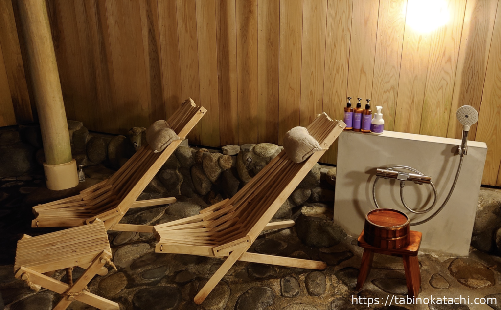 サウナ室を出たところから撮った様子。露天風呂が気持ちよく、ととのいスペースに3脚チェアがありました。岩場のお風呂なので、お風呂のまわりの足場がゴツゴツしており、出入りに注意が必要です。