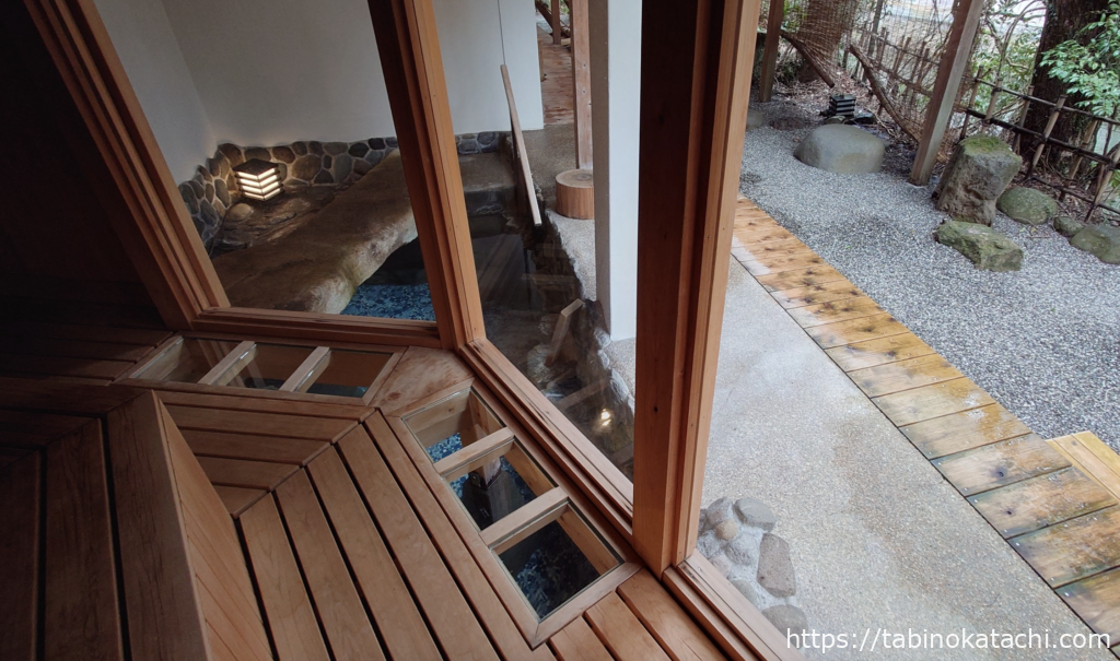 貸切風呂って、色々なお宿であるとおもうのですが、こちらの貸切風呂は、本当に広くて、スケールがちがいますよ!「星の湯」は、離れにあります。こちらが本館をでるところ。事前に鍵を、フロントで借りて、向かいます。