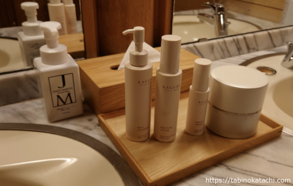 脱衣所は、シンプルで清潔。タオルも基礎化粧品もおいてありますので、お部屋から手ぶらでOKです。基礎化粧品は、お部屋においてあったものと同じ、KAGURE。ドライヤーやその設備も基本的におなじものが用意されているようです。