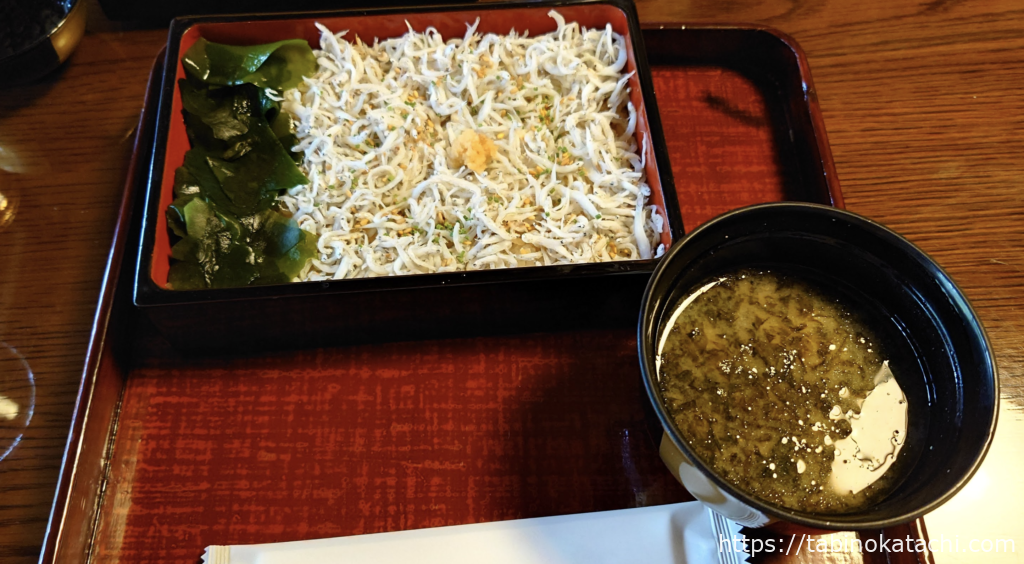 あめおくんと、息子は、釜揚げシラス丼にしました。こちらも、たっぷりのシラスに春が旬の生わかめが添えられており、美味〜。アーサーのお味噌汁までついていました!二人ともぺろりです。ランチに、こんな美味しいお食事がいただけるなんて、連泊ならではの楽しさでした。ごちそうさまでした。