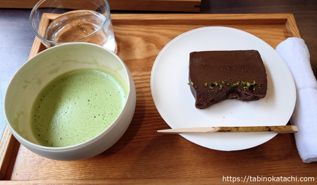 今回いただいたのは、いちごパフェ、お抹茶とお菓子のセット ほうじ茶ショコラテリーヌと、同じくお抹茶とお菓子のセットで 練り切り「河津桜」です。