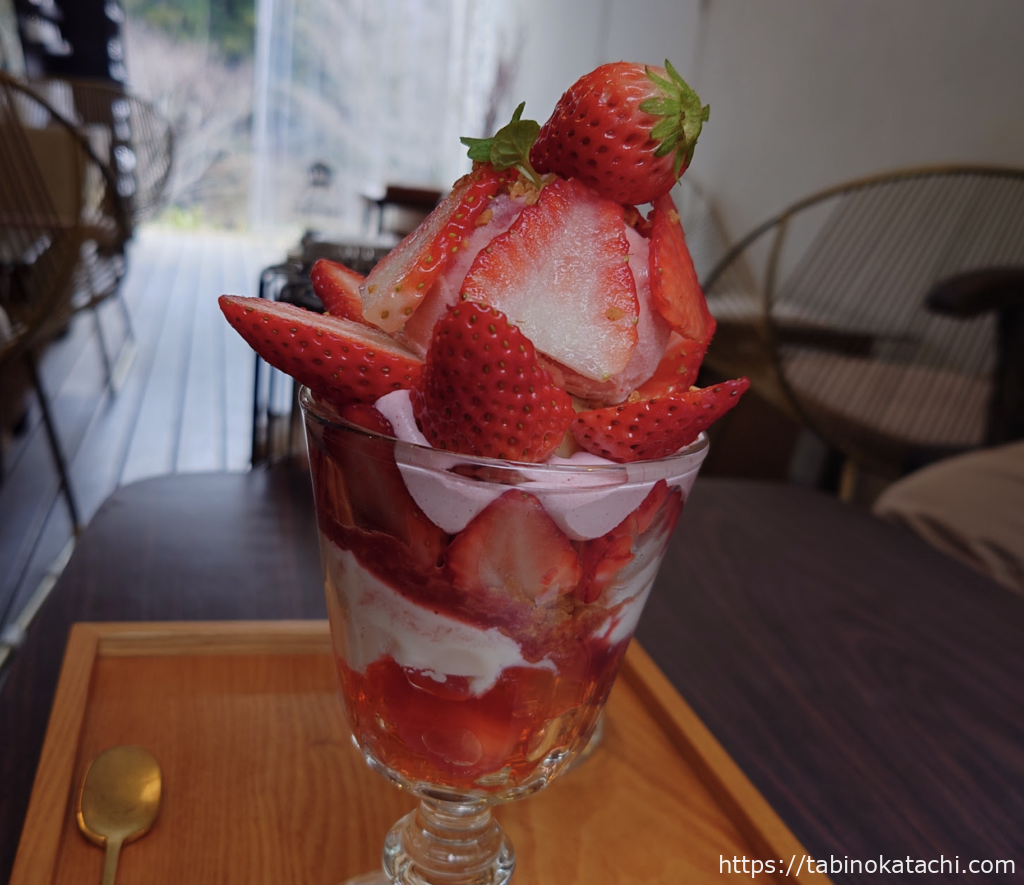 季節限定とあった「いちごパフェ」は、溢れんばかりの苺がのっってきました。