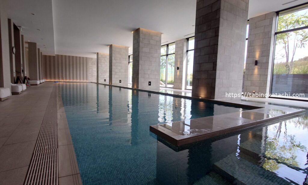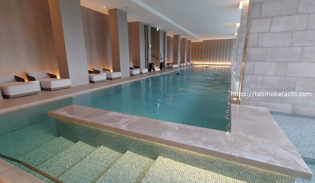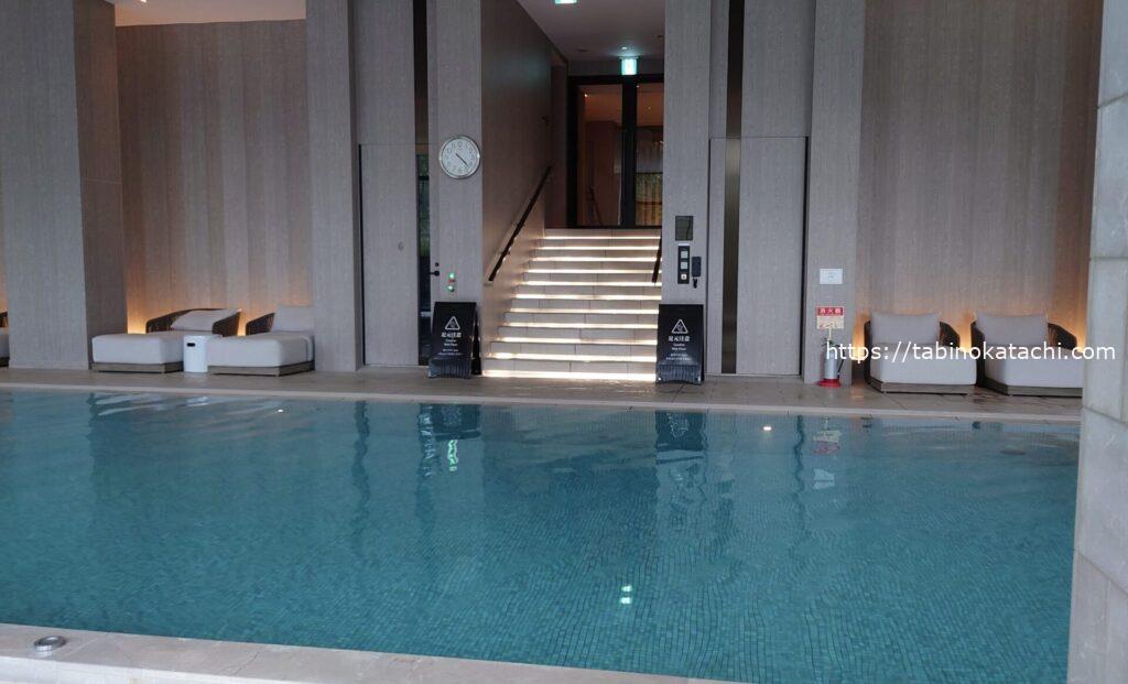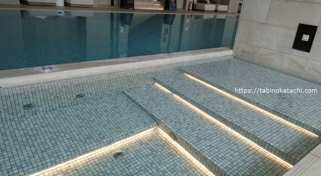 プールの出入りは、緩やかな角度の階段をつかうことができますし、窓際には暖かいジャクジーが5つ完備されているので、年齢を問わず、快適に楽しむことができると思います。プールサイドのチェアも、太めの柱で区切られているので、お隣とゆるーく仕切られて、プライベート感もありますし、細かな点で配慮された素敵なデザインだとおもいました。