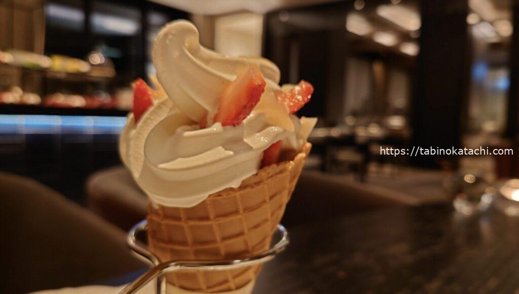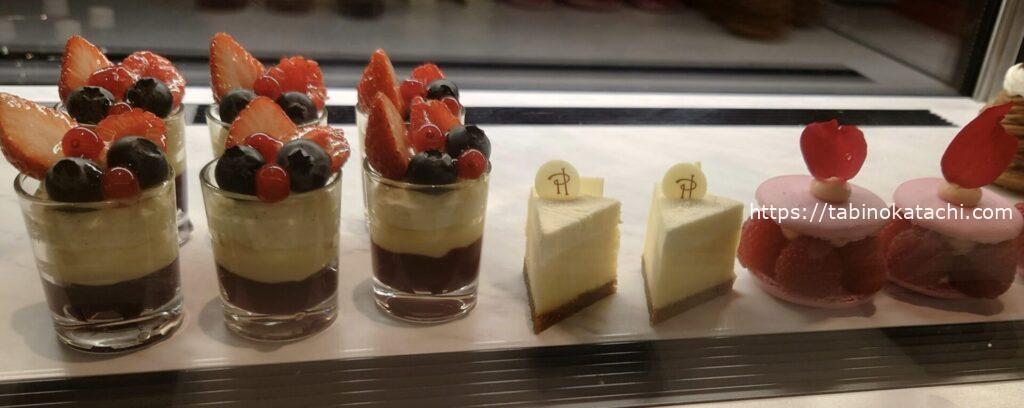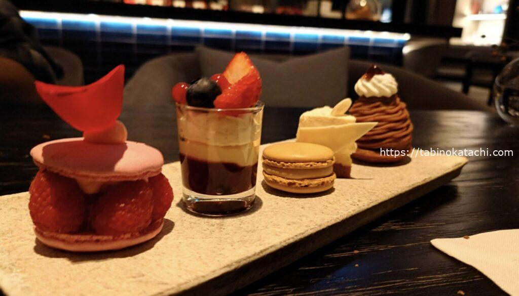 ピエール・エルメ・パリのアフタヌーン・ティーもいただける、こちらのラウンジ。ディナータイミングにも、美味しそうなスイーツがずらり!こちらが目当てで、ディナーに選んだといっても過言ではないです。もちろん、デザートとしていただきました。