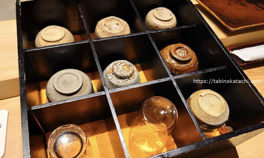 日本酒は、お好きなお猪口を選べるという趣向もあり、面白い。
