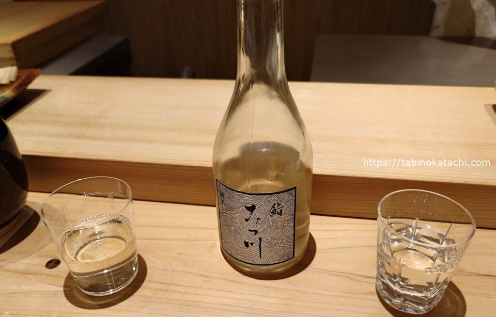 お席に案内いただいて、飲み物は、日本酒を選択。大将におすすめを聞いたところ、みつ川オリジナルの日本酒がありますよ、ということだったので、おすすめをいただきました。金沢にある酒蔵 福光屋さんとのコラボされたお寿司にあう純米酒だそうです。