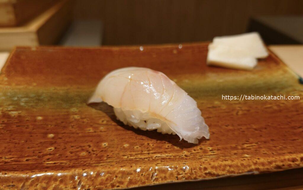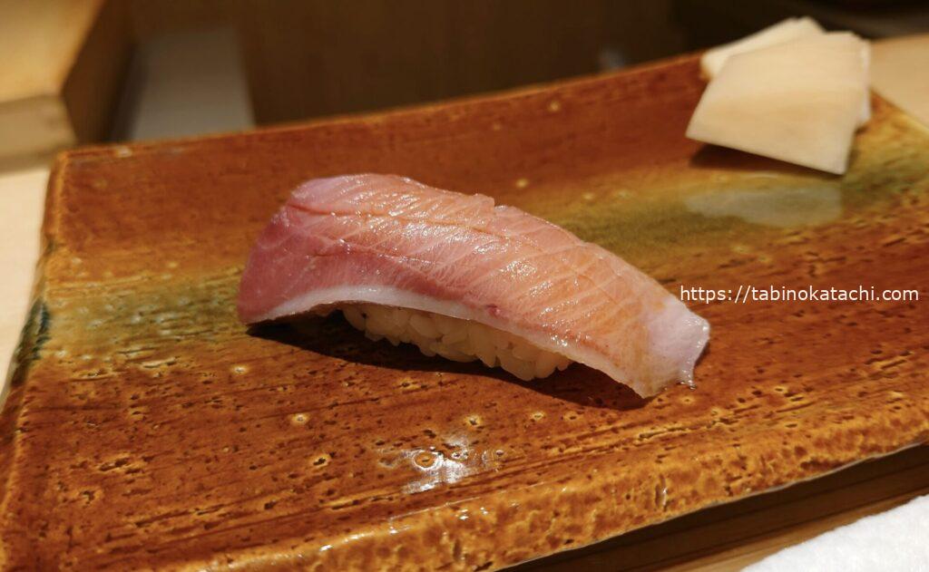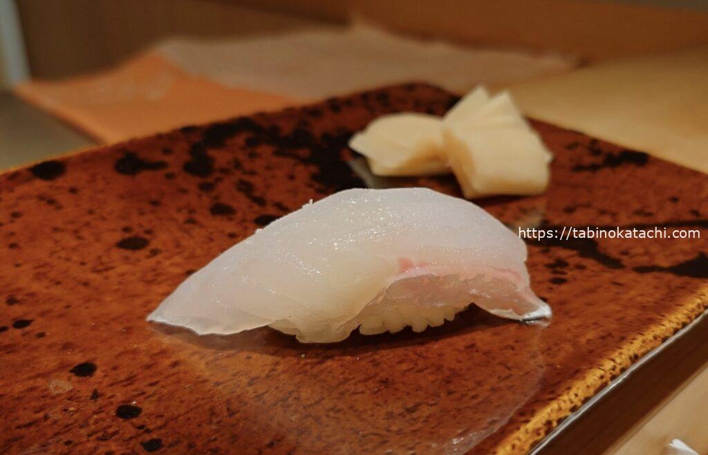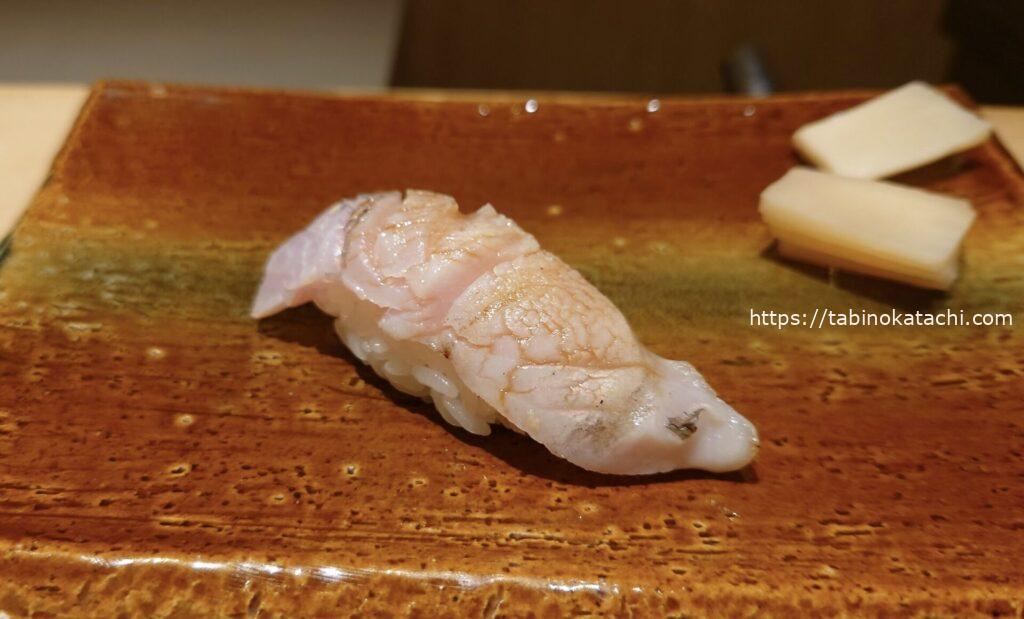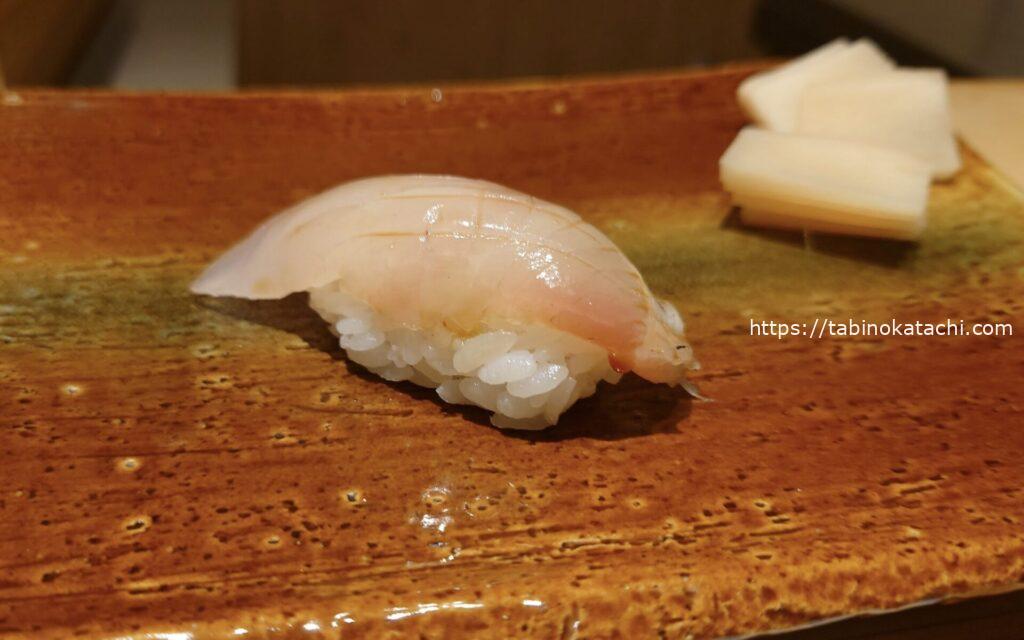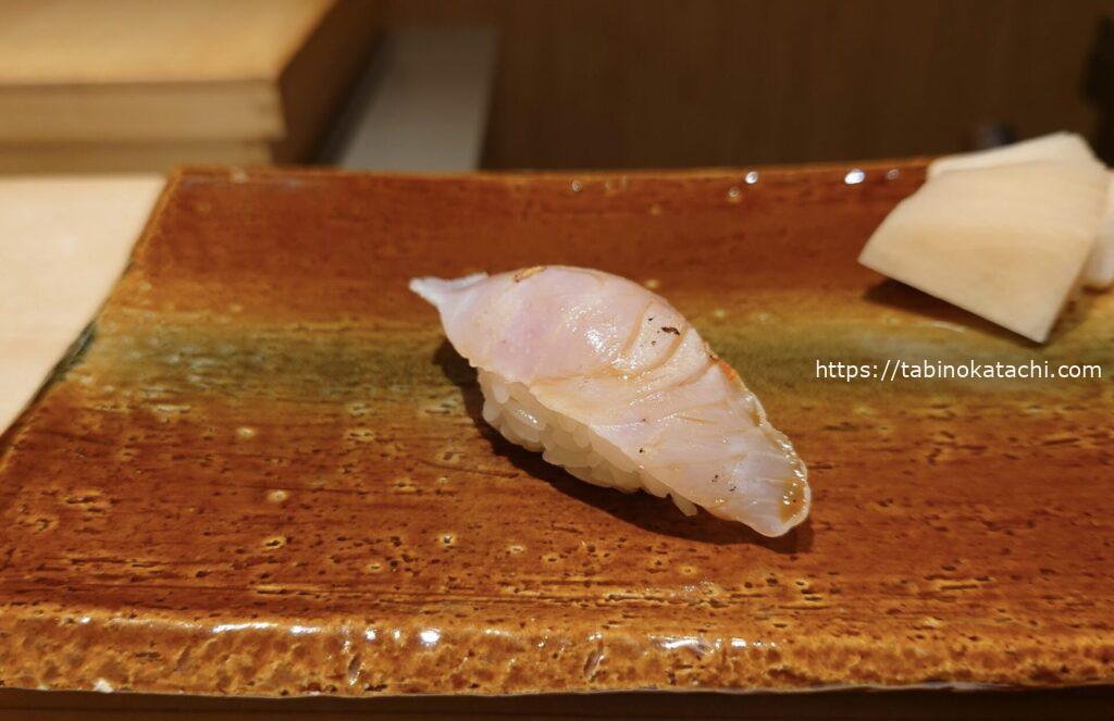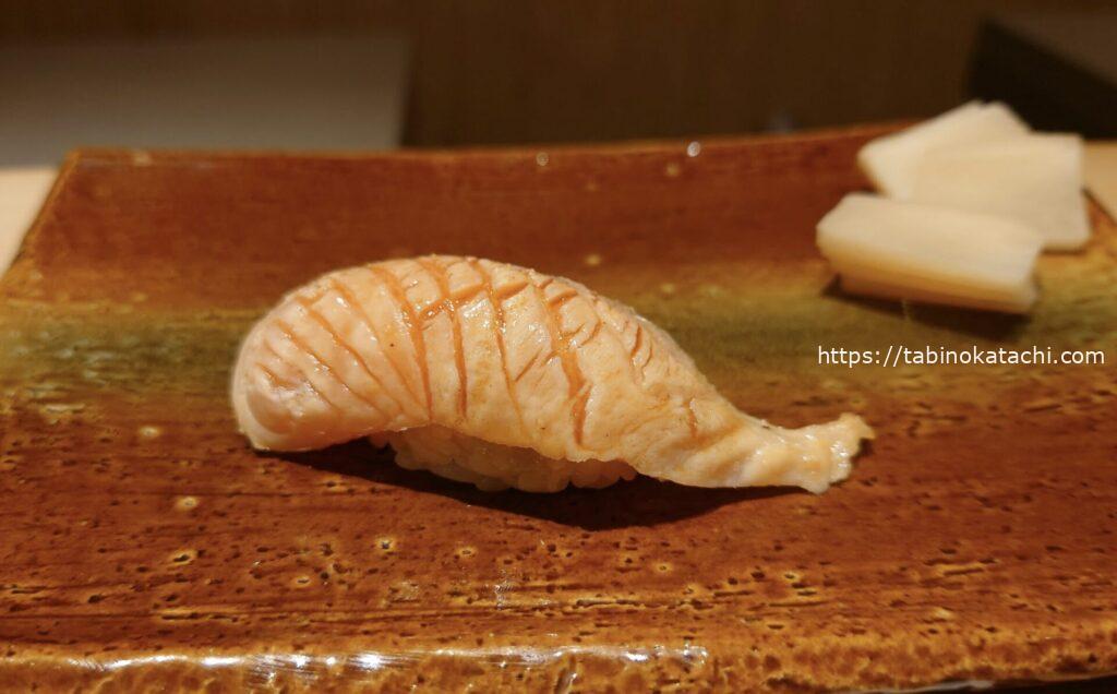 お次はブリ。一番脂がのっているお腹のところですとのご説明。あまくて、とろとろ!そして、金目鯛の炙。お塩がのって美味しすぎる。炙りが最高ですね。香ばしさとお魚の甘さが相まって、日本人に生まれたことに感謝・・・・。