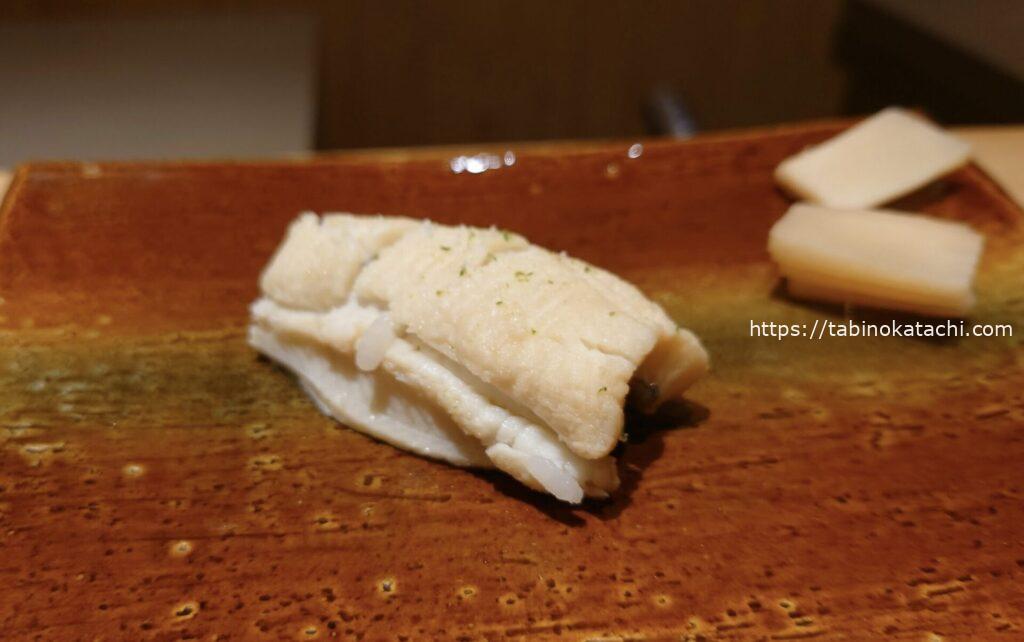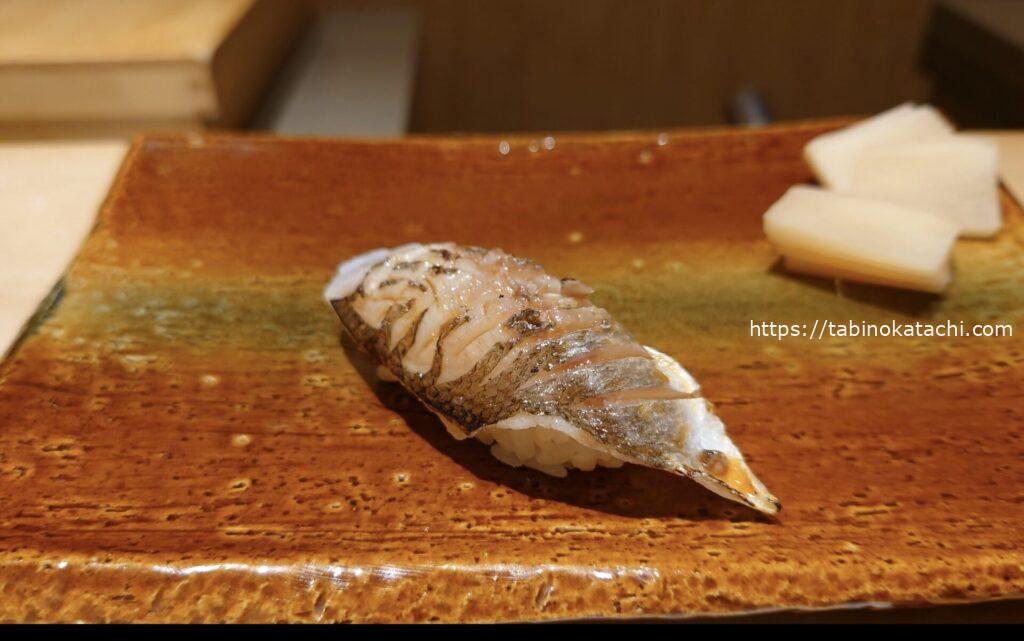 鹿児島県産のシマアジ。引き締まった身が美味しい。マグロの漬けは、漬け加減が最高。目を閉じて食べたくなる感覚。味わい深い。。。お次のカマスの炙りには、梅肉が間に挟んであり、よいアクセント。炙りも香ばしいです。