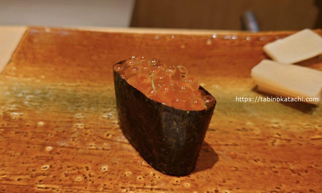 キンングサーモンの和名「おおすけ」。北海道産。塩加減が絶妙で、味の甘さが引き立ちます。いくらの軍艦は、間違いないお味。ほのかに柚子風味!