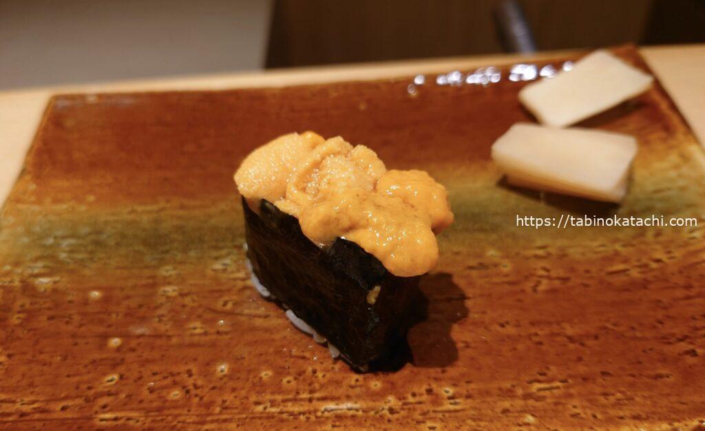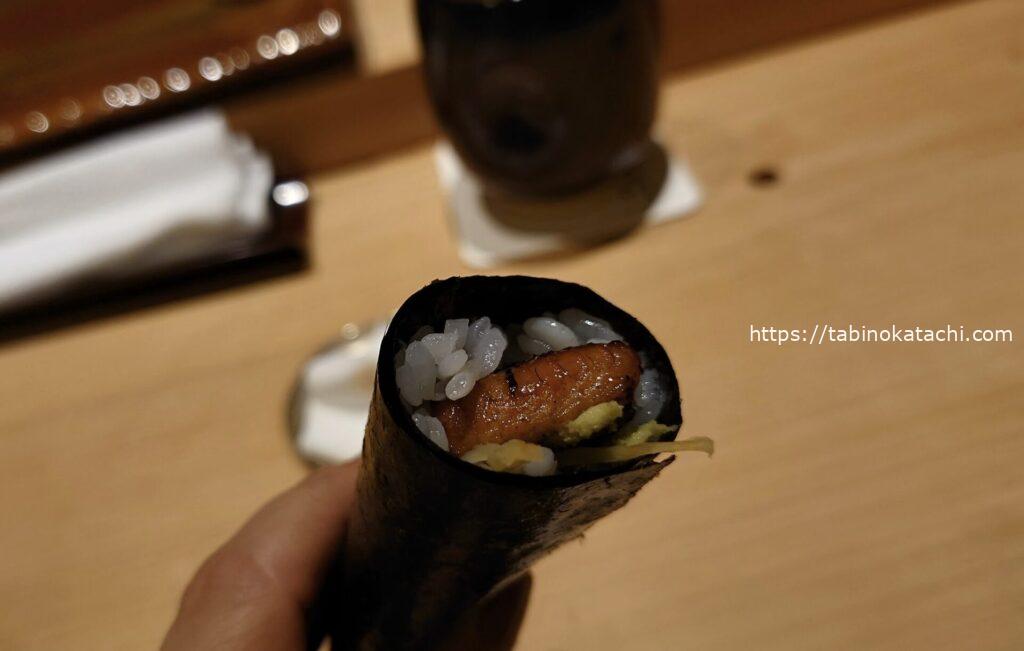 北海道 浜中で養殖されているバフンウニ。白菜やカボチャを食べているんだそうです。甘くて、旨し!岩手県産の煮アナゴ。ふわふわの煮アナゴの上には、柚子とお塩。アナゴは断然タレだと思っていたけど、お塩も合いますね。巻物最後は、うなぎとお新香の巻きもの。