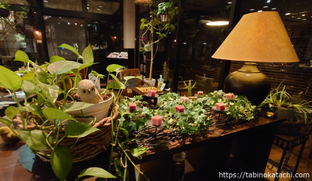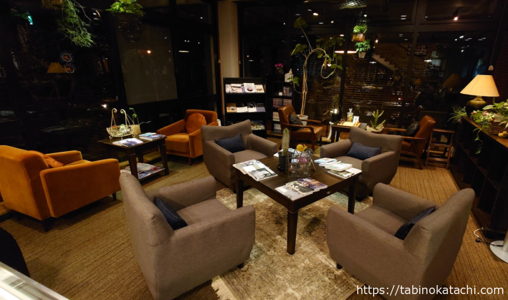建物にはいると、すぐにロビーラウンジがあります。一気に森のリゾートに来た感が増します。所狭しと小物や家具が配置されているのですが、1つ1つテイストがステキなので、まとまりのある空間となっています。宿泊の受付は、入口をはいって左手のフロントで行っていただき、すぐにお部屋にご案内いただく形です。