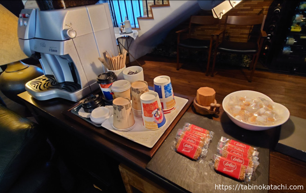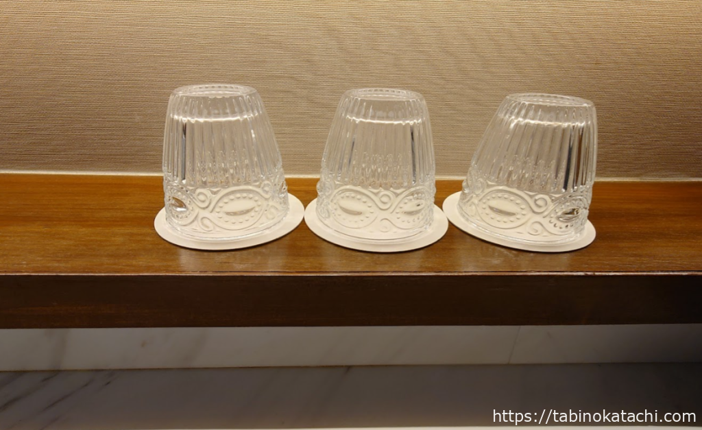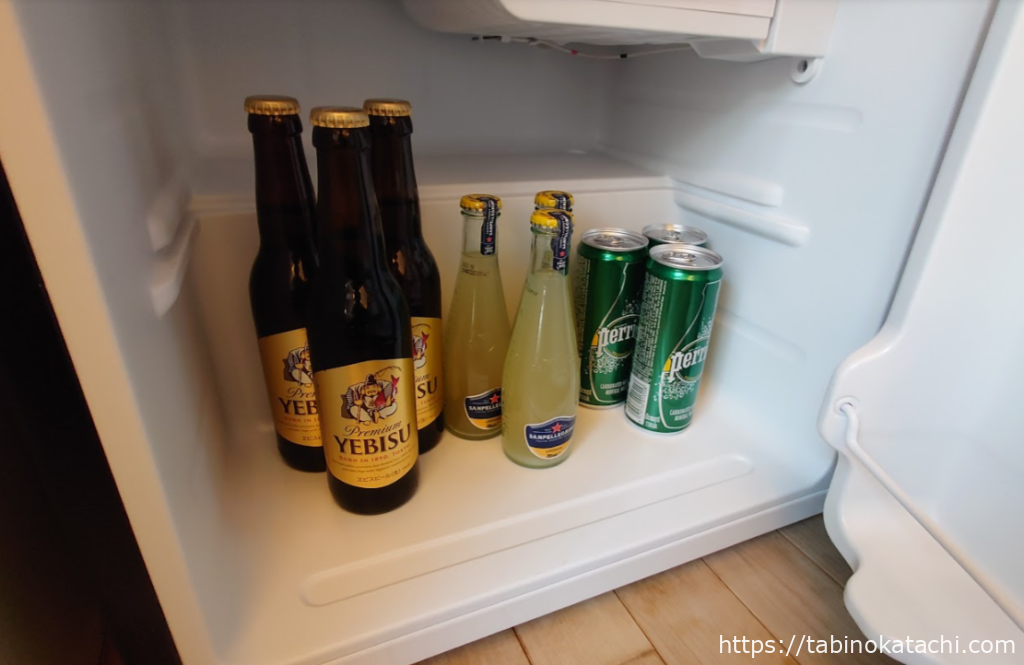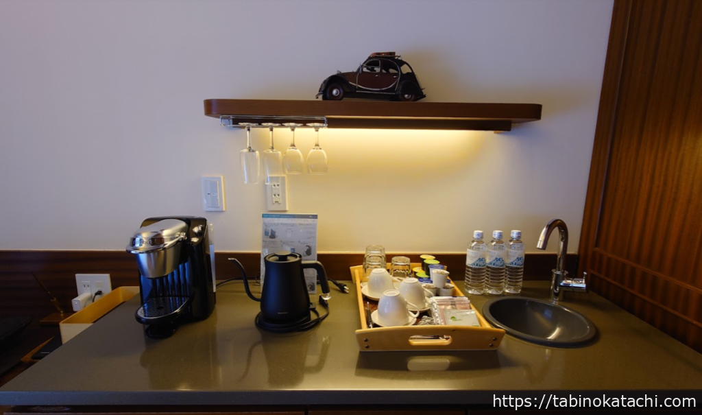 ミニバーには、ちょっとしたシンクもあります。コーヒー、紅茶、緑茶などのほかに、冷蔵庫のドリンクは、無料ですとご案内いただきました。お宿のご案内には、料金の記載があったので、特定のお部屋の宿泊限定のサービスなのかもしれません。