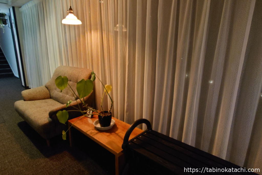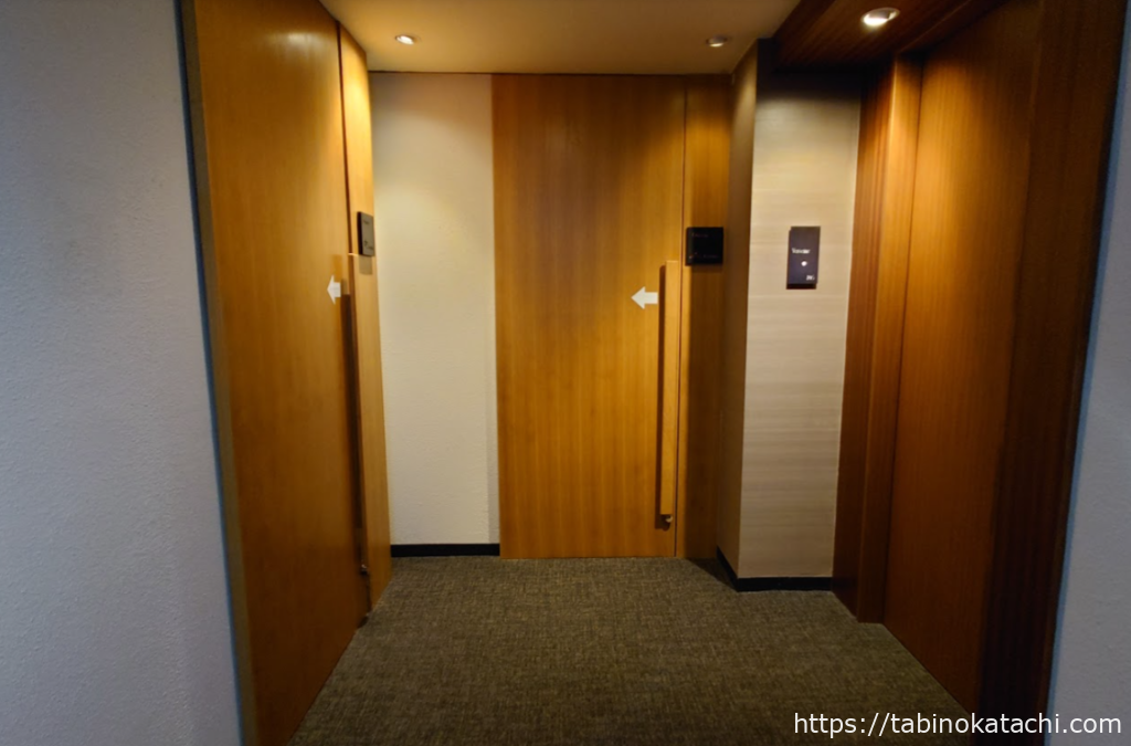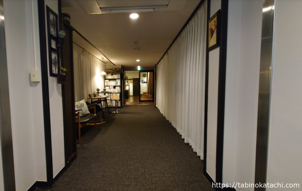 お部屋は、ロビーから廊下をとおり階段を下りたところにあります。エレベータはなく、階段の利用になります。