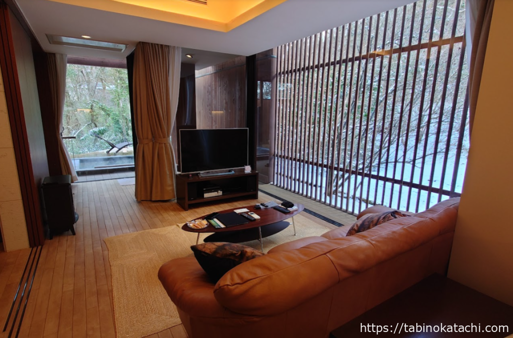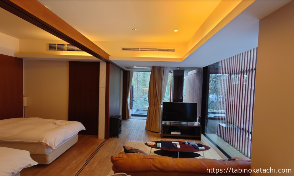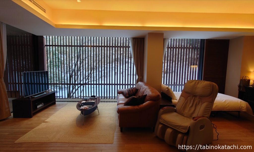お部屋に到着。漣さんのWEBページにある写真の通り、素敵な空間です。我が家は、3名宿泊だったので、エキストラベットも用意いただいていました。本来はエキストラベットのあるところに、マッサージチェアが配置されていると思われます。TVの奥にみえるのが、お部屋専用の露天風呂(温泉)です。何度来ても、素敵な空間です。
