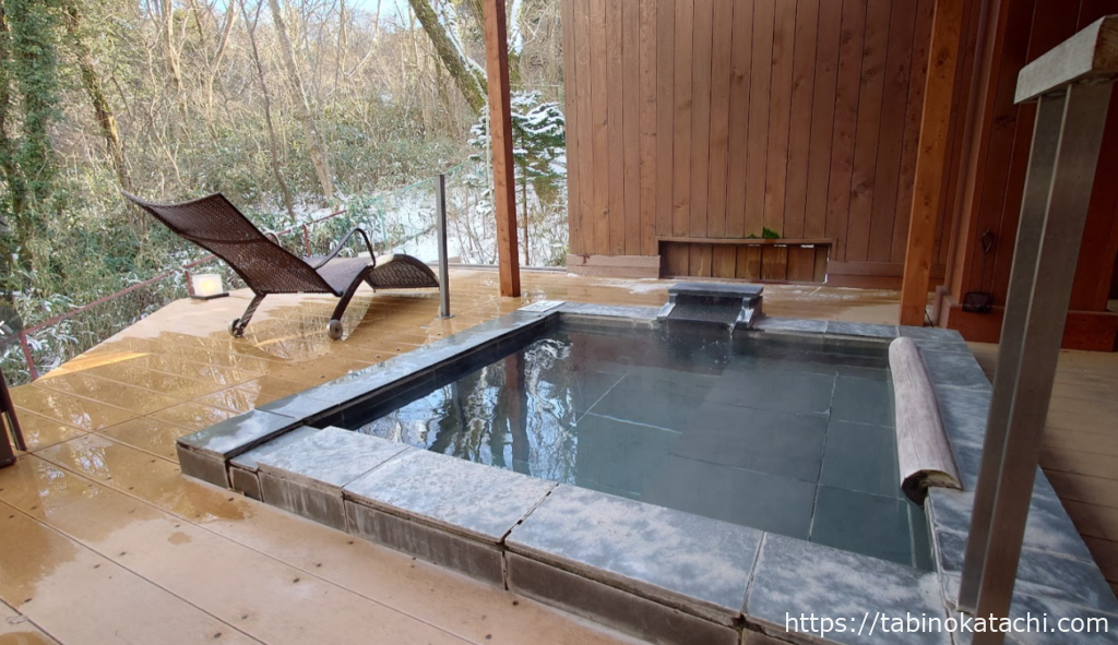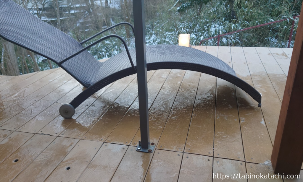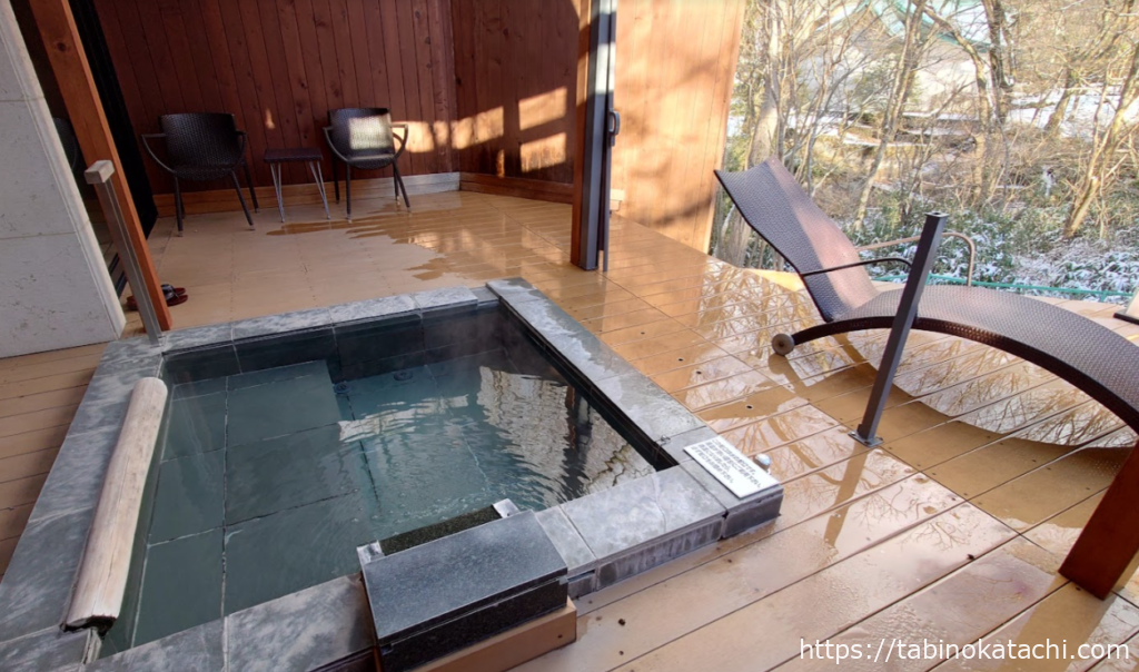 お部屋の露天風呂も温泉というのが贅沢すぎます。大人二人がゆっくり入れる大きさです。目の前には木々があり、お風呂上りに、まったりとできるリクライニングチェアなども置いてあります。敷地の先には、別の施設がみえるので、露天風呂の目隠しができるようなシェードも設置がありました。新緑の季節だと、周囲が緑に囲まれて、気持ちいいでしょうねぇ。
