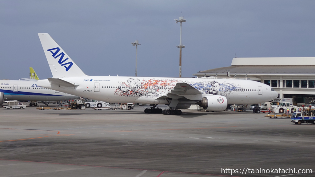 那覇空港で、ANAの鬼滅ジェット発見! どうやら3種類あるらしく、こちらは”参”の機体